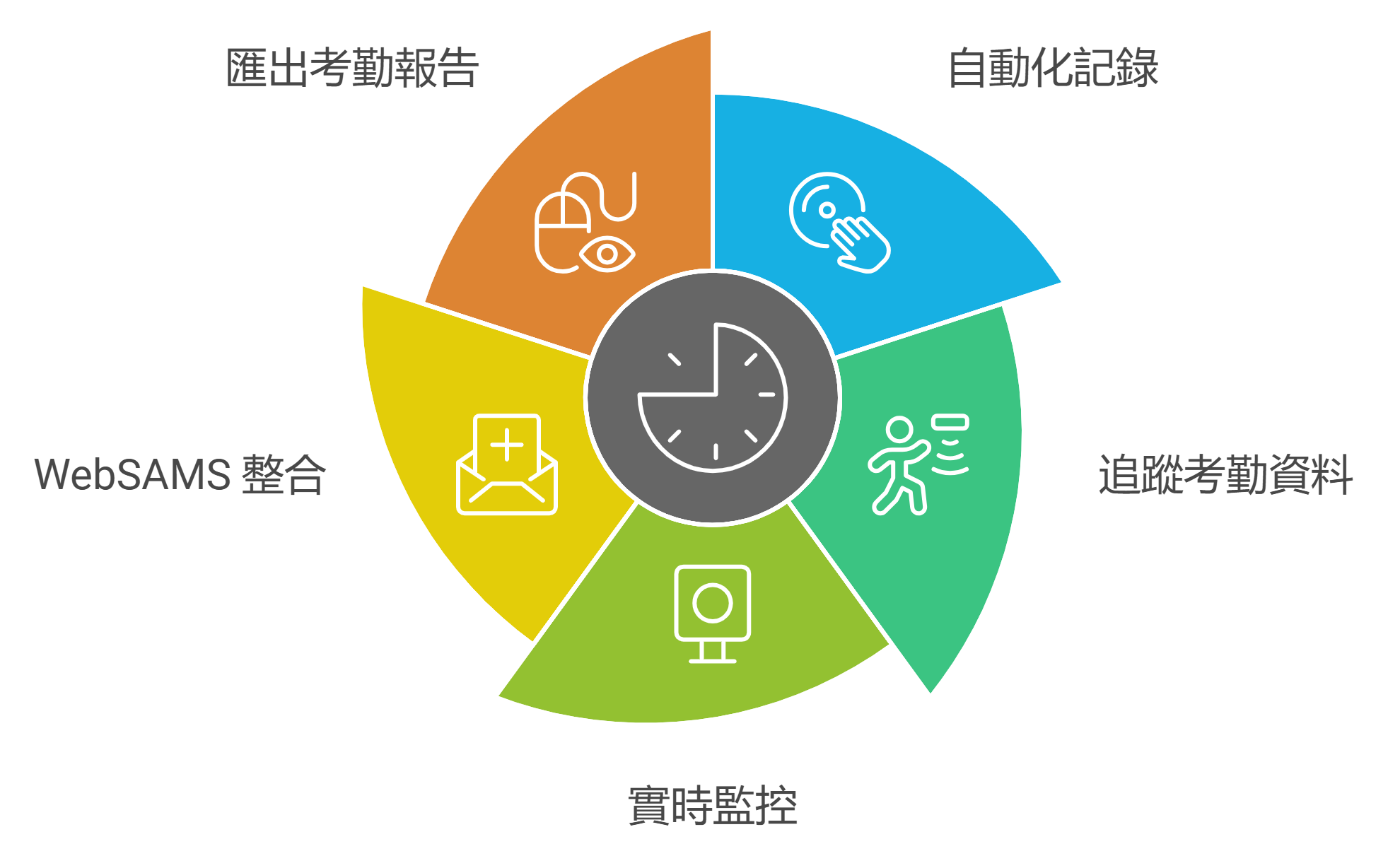 考勤報告直接匯入學校WebSAMS系統作整合,省卻人力無需重複輸入資料。