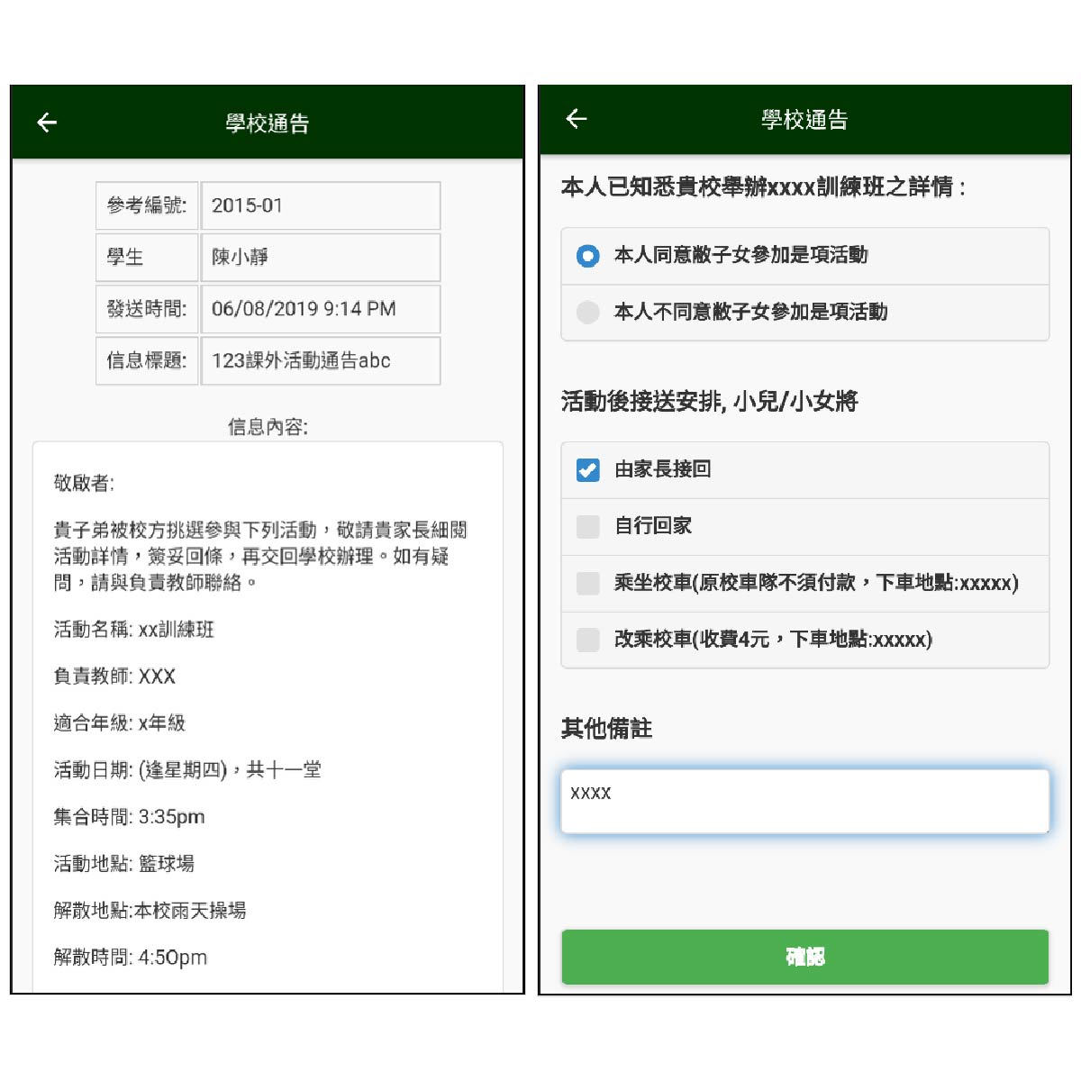 家長使用設定的密碼,查閱通告及答覆回條